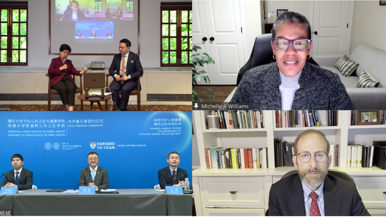 Tsinghua Vanke School of Public Health and Harvard T.H. Chan School of Public Health held a virtual MoU signing ceremony on December 2. Dean Margaret Chan of Tsinghua Vanke School of Public Health and Dean Michelle A. Williams of Harvard T.H. Chan School of Public Health, entered the agreement which outlines collaboration to advance global health security. Professor Yang Bin, the Vice President and Provost of Tsinghua University, and Professor Alan Garber, the Provost of Harvard University, witnessed the signing and delivered remarks. The signing ceremony was hosted by James Chau, the Special Advisor to Dean Margaret Chan.