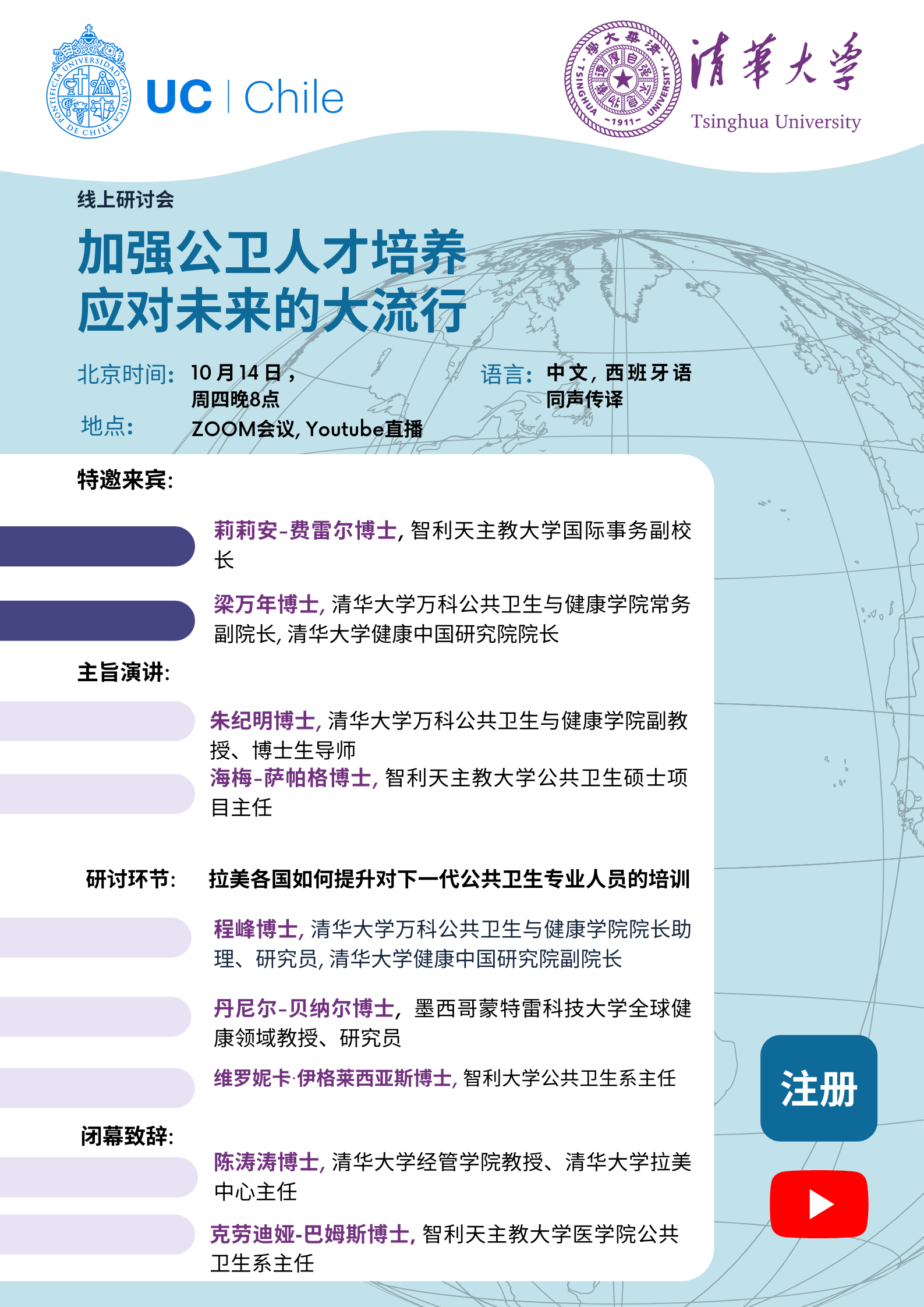 新冠肺炎疫情的全球流行让各国都关注到公共卫生领域人才培养的重要性和迫切性。为加强下一代公卫人才培养的国际交流与合作,从不同地区、不同国家、不同文化在公卫人才培养方面的实践中吸取经验,以提升大流行应对能力,加强全球公共卫生安全体系建设。清华大学与智利天主教大学共同举办“加强公卫人才培养 应对未来的大流行”线上研讨会。