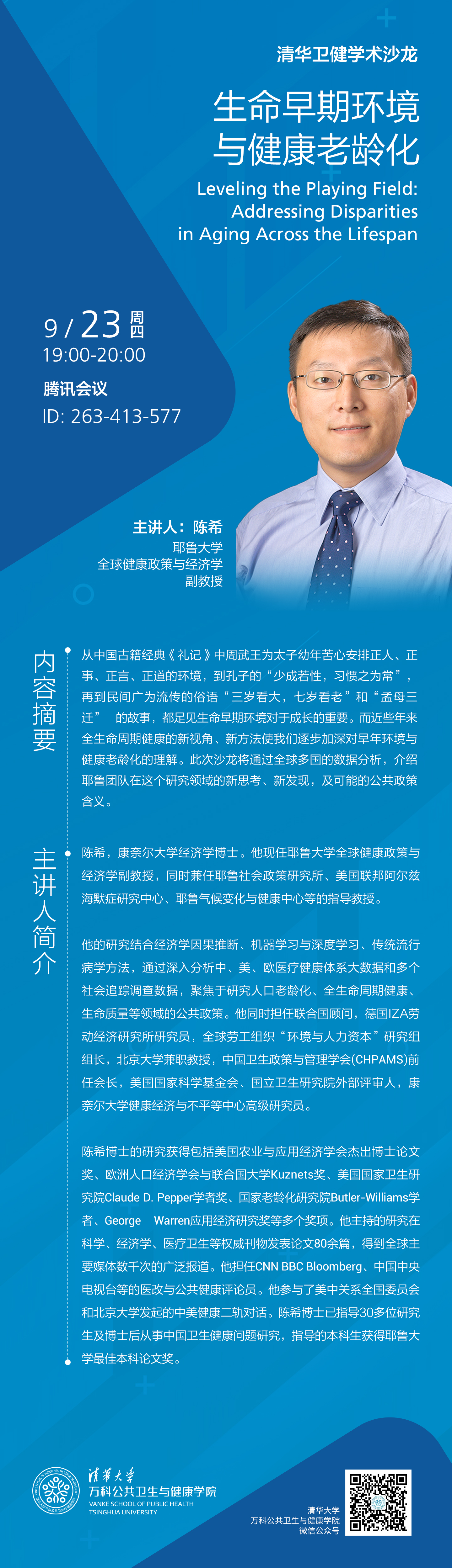 从中国古籍经典《礼记》中周武王为太子幼年苦心安排正人、正事、正言、正道的环境,到孔子的“少成若性,习惯之为常”,再到民间广为流传的俗语“三岁看大,七岁看老”和“孟母三迁” 的故事,都足见生命早期环境对于成长的重要。而近些年来全生命周期健康的新视角、新方法使我们逐步加深对早年环境与健康老龄化的理解。本学术讨论将通过全球多国的数据分析,介绍耶鲁团队在这个研究领域的新思考、新发现,及可能的公共政策含义。