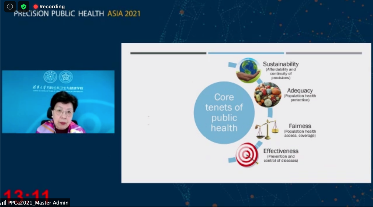 陈冯富珍在发言中表示,精准公共卫生是将基因学、大数据、人工智能等卫生领域前沿科技与创新技术应用到公共卫生政策、疾病管理与干预之中,以提升其干预措施的准确性。她指出,精准公共卫生已开始改善人们的生活方式,它不仅被用于非传染性疾病的管理,如全天候血糖监测仪等可穿戴设备;也被用于管理流行病及大流行病,如在抗击新冠肺炎的过程中大数据及信息技术被广泛应用,包括新冠肺炎地区风险实施热点图、用于记录行动轨迹的健康宝、无接触服务机器人等,均能有效地保障公民的健康。她强调,公共卫生的四大宗旨同样适用于精准公共卫生的发展,即可持续性、充分性、公平性及有效性。同时,精准公共卫生的发展也面临着诸多挑战,例如相关政策对于发展中国家是否具有可持续性,政府资金预算是否足以支付基础设施建设,数字信息技术资源在城镇与乡村的分配上是否公平,用户隐私管理、数字信息安全管理等方面是否有完善的政府监管制度等。最后,她在发言总结中提出,精准公共卫生需要多领域、多学科的共同努力与合作。在今后的发展中既要注重干预效果的提升,也应注重成本的控制,以寻求更加公平、平等且可持续的公共卫生解决方案。