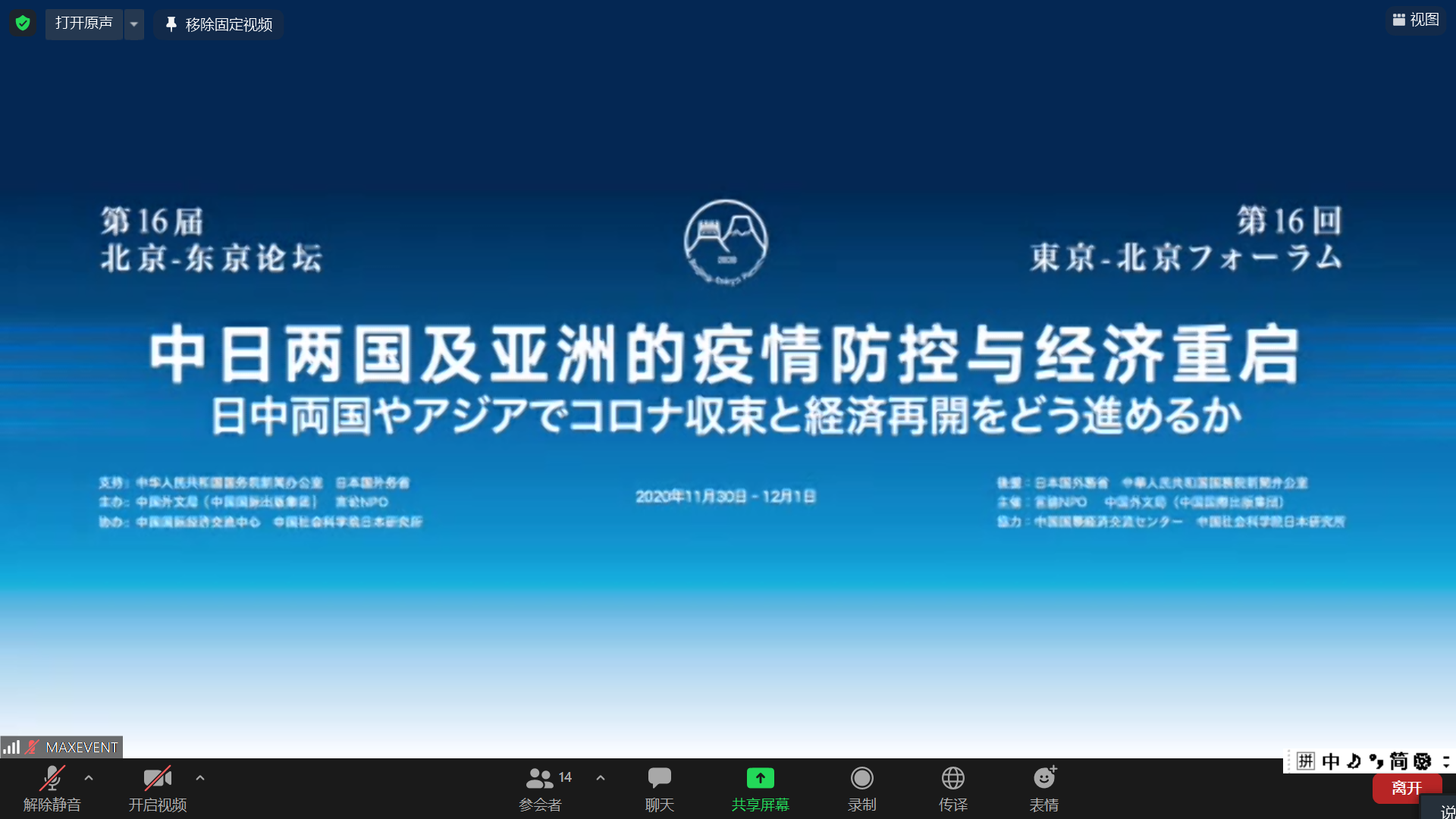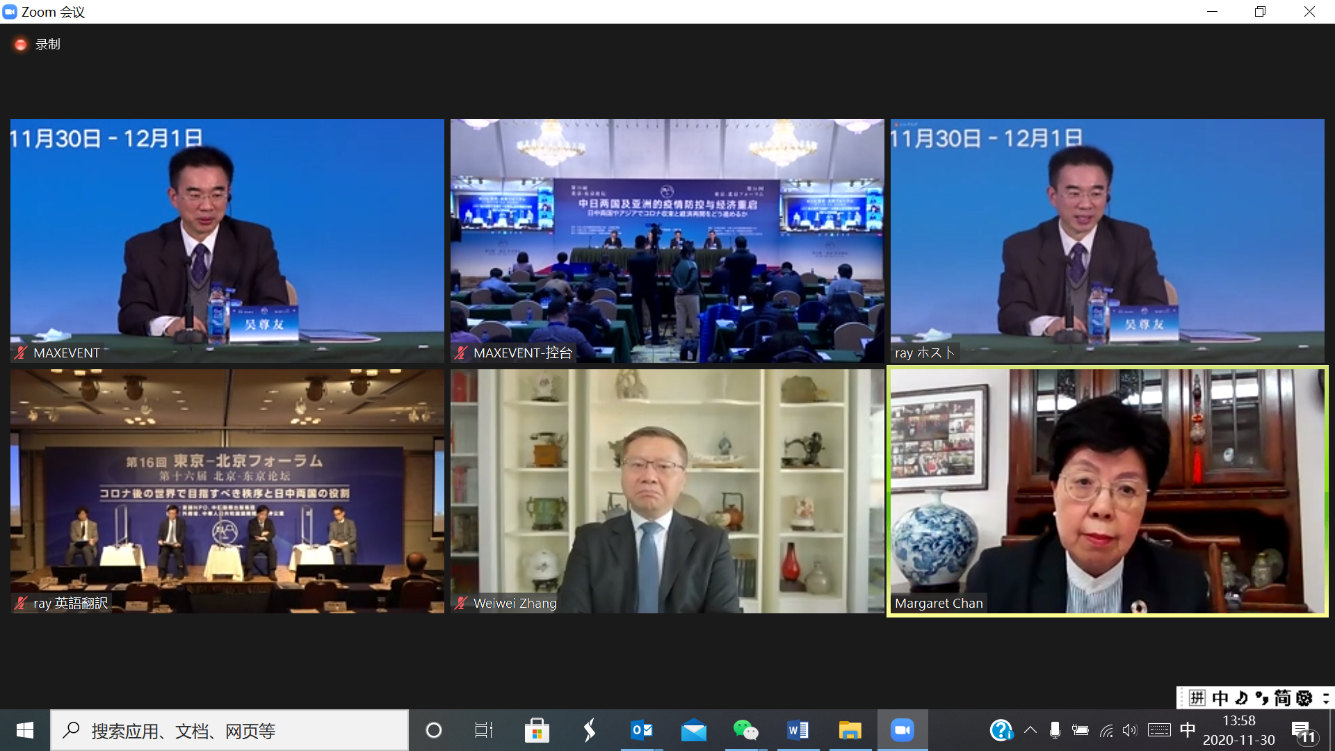 院长陈冯富珍博士应邀出席第十六届“北京-东京论坛”公共卫生分论坛,并就中日两国及亚洲的疫情防控与经济重启这一主题发言,同时结合自身经历,就日方参会嘉宾关注的中国疫情防控问题进行了交流。