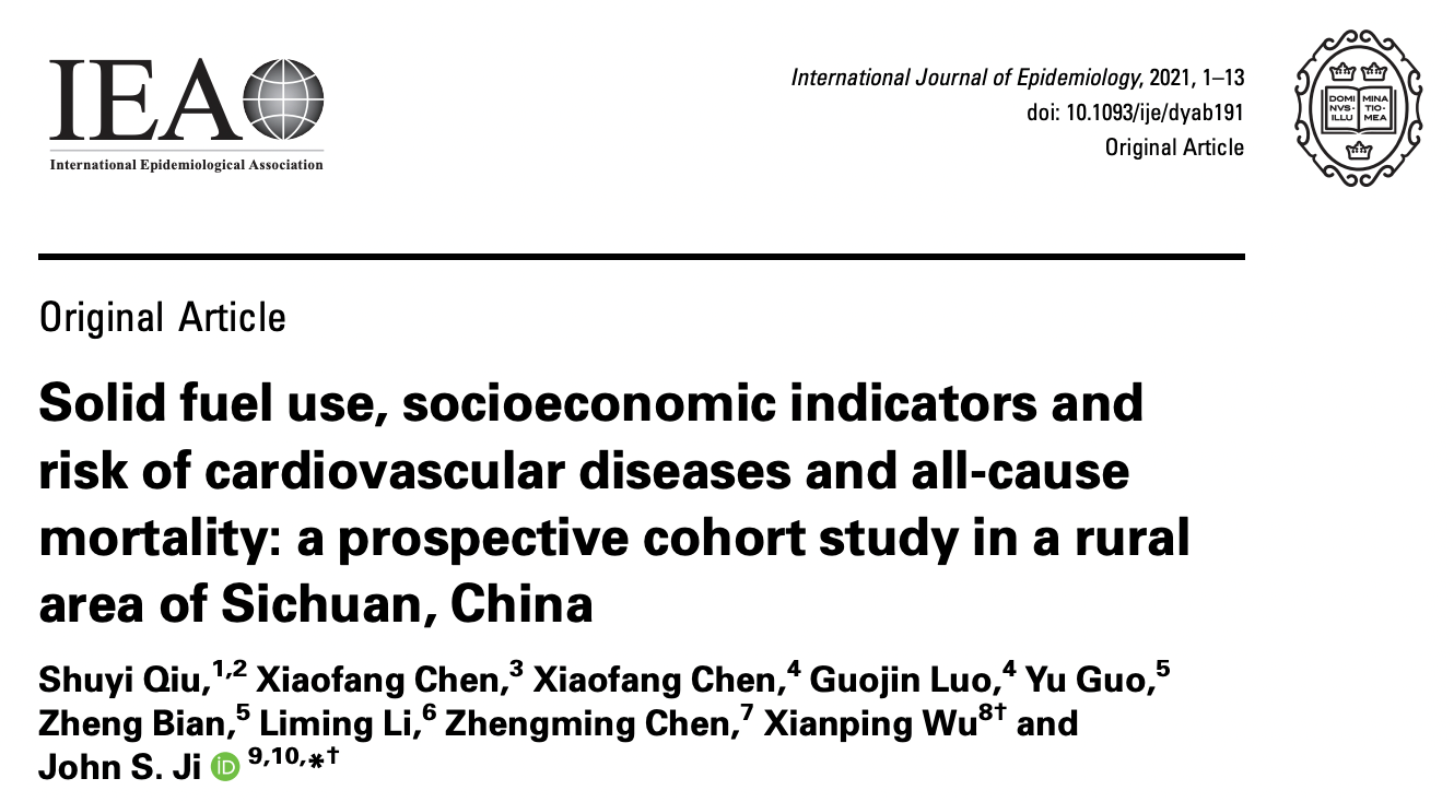 近日,环球体育-环球体育官网 副教授纪思翰(John S. Ji)教授及其团队与四川省疾病预防控制中心在《国际流行病学杂志》(International Journal of Epidemiology)合作发表文章“固体燃料使用、社会经济因素和心血管疾病及全因死亡率:基于中国四川农村地区的前瞻性研究”(Solid fuel use, social-economic indicators, and risk of cardiovascular diseases and all-cause mortality: a prospective cohort study ina rural area of Sichuan, China)。