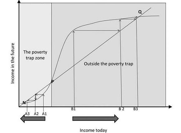 许多低收入家庭之所以无法跳出贫困陷阱(下图收入S曲线前段),是因为他们无意也无力将现有的资源投入到可以改变现状、提高未来收入的投资中去。因病致贫是导致低收入家庭陷入贫困陷阱的重要因素之一——由于疾病而造成的健康损失降低了未来预期收入,从而使得人力资本提升的可能性更低,低收入家庭更难以跳出贫困的怪圈。为了更有效地巩固脱贫攻坚的成果、推进乡村振兴的目标,理解和评估固体燃料的使用和社会经济因素的关系及其对健康造成的风险就显得尤为重要。