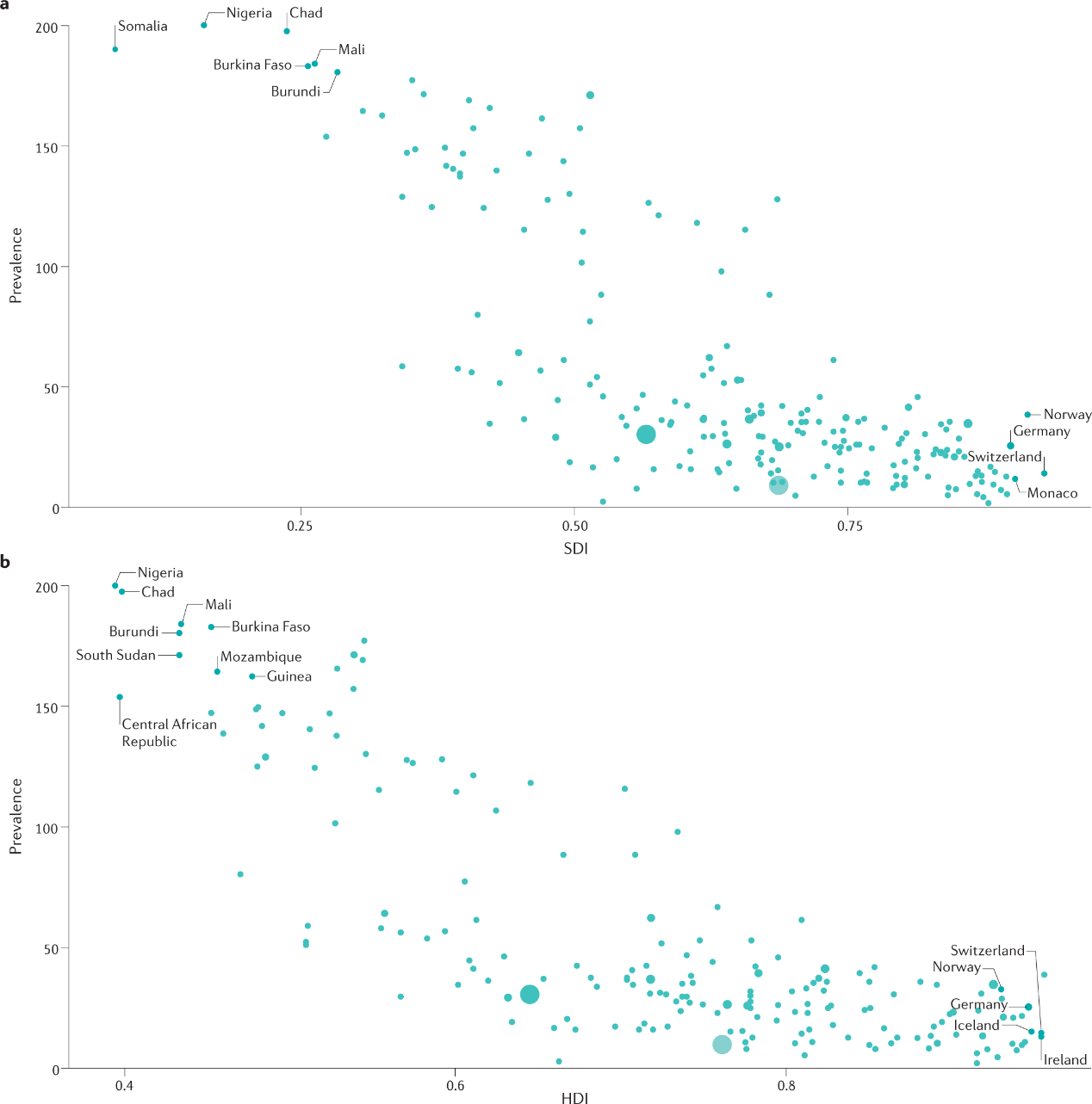 为了进一步说明在国家层面上妊娠期高血压负担的潜在差异,该研究将妊娠期高血压的疾病负担分别按“国家和社会人口指数”(SDI)和“人类发展指数”(HDI)进行分层。研究发现,可持续发展指数和人类发展指数较低的国家一般有更大的妊娠期高血压疾病负担,表现为较高的患病率、伤残调整寿命年(DALYs)和归因死亡率。