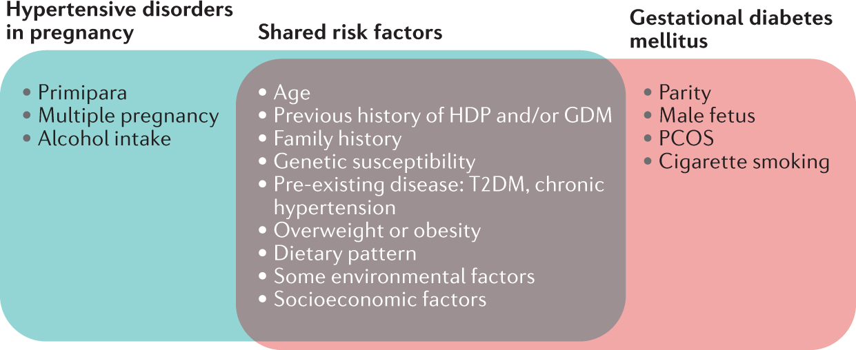 两类疾病具有很多共同的风险因素,包括是否为高龄产妇、超重/肥胖、营养状况、怀孕前和/或怀孕期间的饮食模式、遗传因素和疾病史等。此外,种族、民族、社会经济和环境等因素也被证明与两类疾病有显著的相关性。