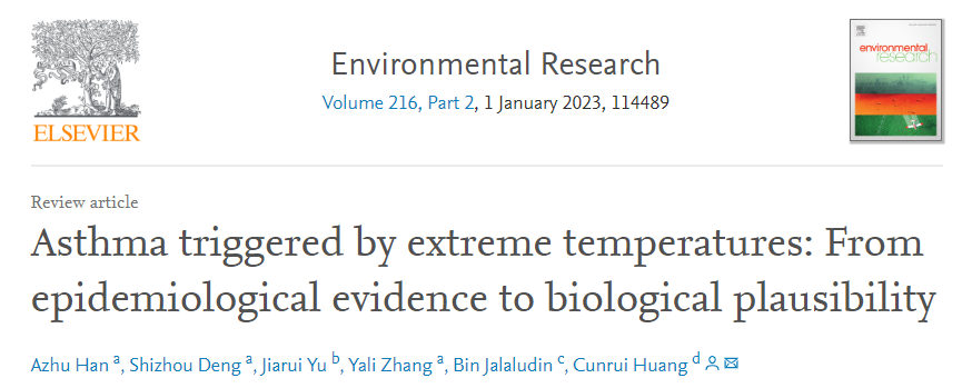 教授黄存瑞课题组在Environmental Research上发表题为“Asthma triggered by extreme temperatures: From epidemiological evidence to biological plausibility”的综述文章。系统梳理了极端气温诱发哮喘发作的流行病学和影响机制实证性研究,阐明高温、低温和温度变化对哮喘发作的健康效应及其与室内外环境和个体脆弱性因素的协同作用,并基于Meta分析量化了极端气温引起哮喘发作的风险效应值。此外,文章聚焦哮喘发作的炎症反应机制,强调免疫调节和神经调节在极端气温导致哮喘炎症反应中的关键作用,进而提出极端气温暴露引起哮喘发作的影响机制路径模型。