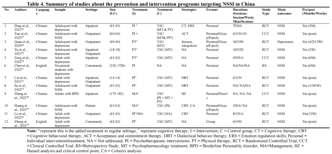 该部分对所有中国NSSI行为相关的预防和干预研究进行了回顾,从研究的出版数量、干预人群、干预策略进行了总结,并描述了综合的实证研究结果。研究发现,干预研究的数量仅为12项,这可能是因为本研究仅纳入概念上明确界定为非自伤性自杀(NSSI)行为的研究。此外,几乎所有相关研究都发表在2020年后,数量逐年增加,其中3/4的研究发表在2022年。这呼吁我们需要更多本土化的预防和干预项目,以期减少中国人群NSSI行为。