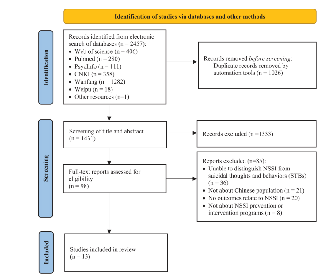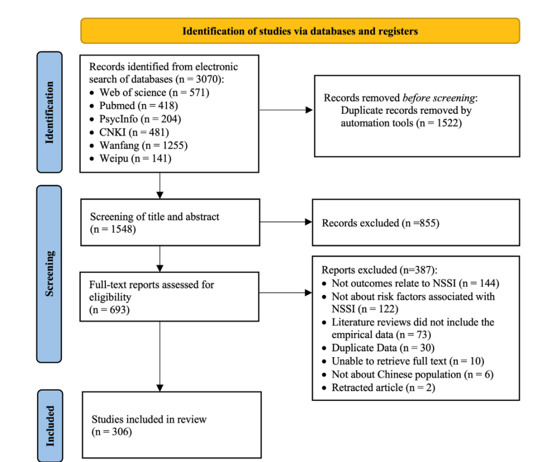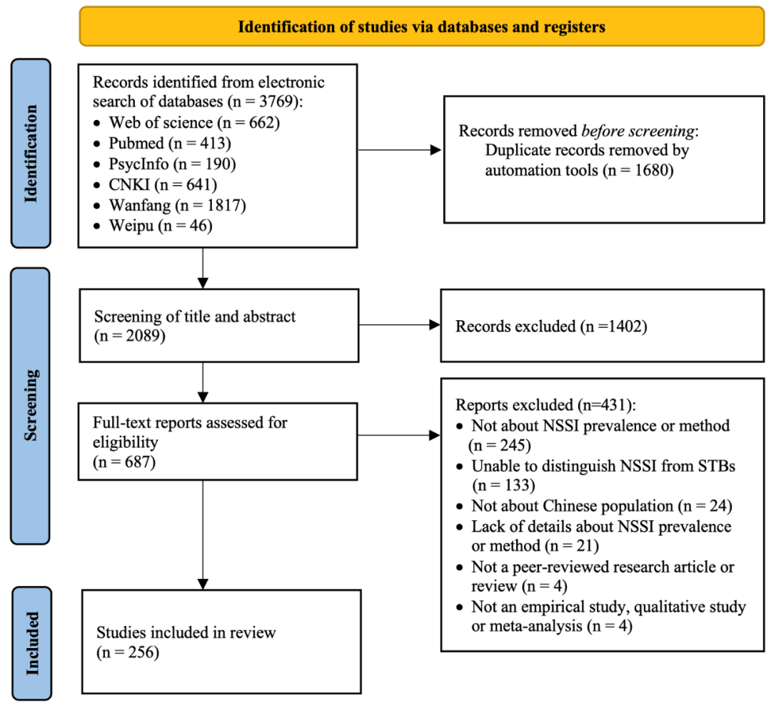 本研究从广泛的文献中综合证据,全面探讨基于中国人群的NSSI研究的趋势和发展方向。研究旨在更深入地了解中国NSSI行为的流行病学现状、方法、危险因素以及预防和干预现状。相较于荟萃分析,本篇综述同时涵盖了多种研究方法(如荟萃分析、定性研究)和研究设计(如纵向研究)。特别值得一提的是,国内的既往相关研究对中国多个群体的NSSI特征进行了深入描述,为中国人群NSSI行为的相关研究奠定了坚实的基础,也为本研究提供了重要的参考和支持。本研究在国内研究成果的基础上进行了总结归纳,以期为中国人群的NSSI行为现状提供更加新颖和全面的证据。