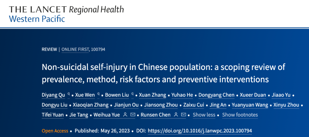陈润森团队在《柳叶刀-区域卫生-西太平洋》(The Lancet Regional Health-Western Pacific)发表了题为: Non-suicidal self-injury in Chinese population: a scoping review of prevalence, method, risk factors and preventive interventions的综述文章,该综述共纳入了国内超百万人的非自杀性自伤(Non-suicidal self-injury behavior, NSSI)人群样本,总结了非自杀性自伤行为的流行率、方法、风险因素以及预防与干预研究的现状。文章共同第一作者为陈润森团队博士后屈笛扬,2022级硕士研究生温雪,科研助理刘博文,通讯作者为陈润森,共同通讯作者为北京大学第六医院岳伟华教授。其他合作者来自中南大学湘雅二医院、上海交通大学医环球体育