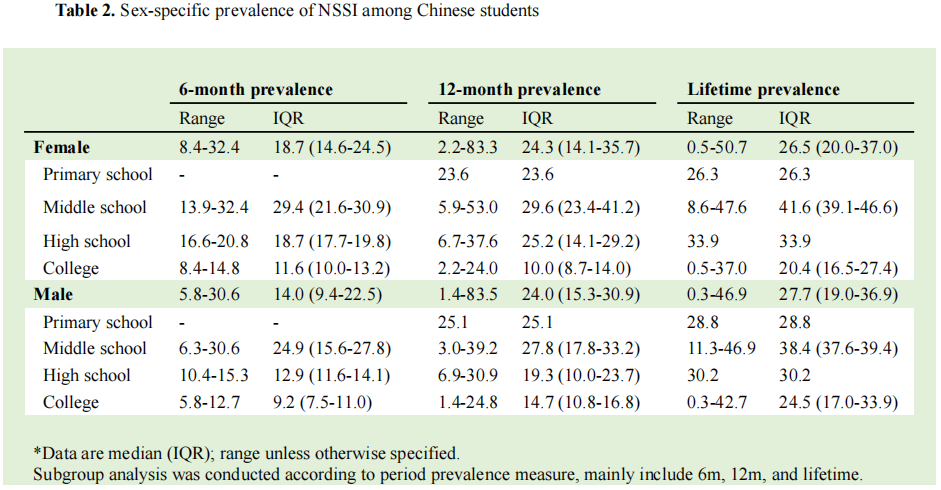 研究分别根据年龄、性别对国内全年龄段学生的NSSI流行率及方法进行了描述。分析结果表明,我国学生群体中NSSI行为的流行率较高。常见的NSSI方式包括抓挠、击打、咬等。研究还特别关注了特殊群体(例如留守儿童、残障人士)并进行了多个特定群体的亚组分析,以期更深入地了解了这些人群的心理健康问题,并为相关政策和干预措施提供更精确的指导和建议。