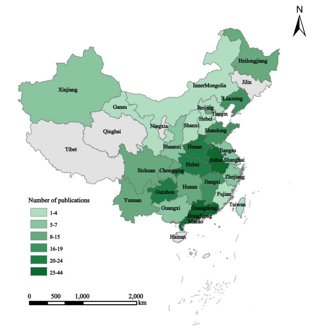 Figure 3. Provincial distribution of 228 papers included in the analysis based on the location where the study was conducted.