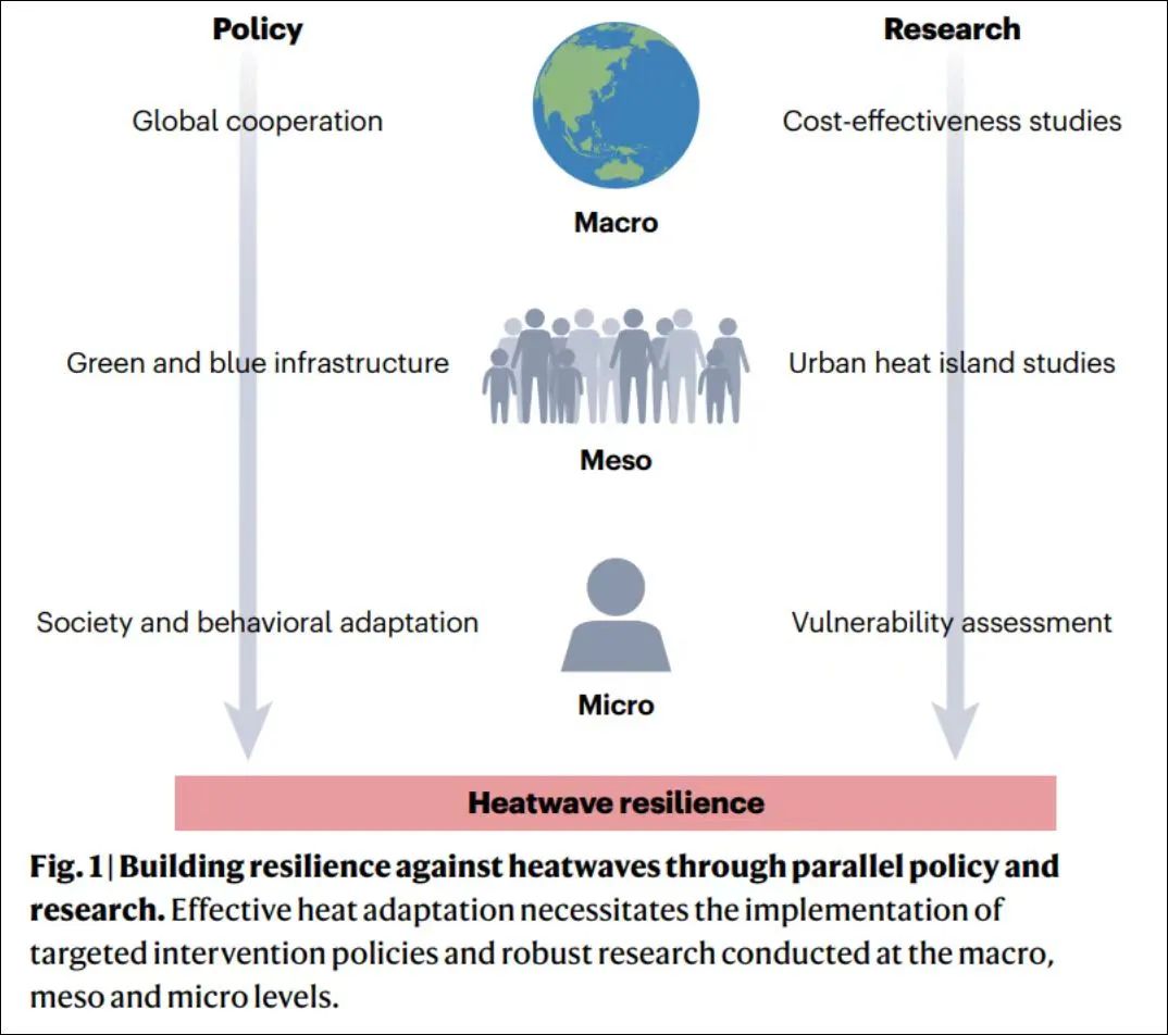 该评论文章指出,不断增长的热浪频率和严重程度可能已经超过了现有措施的应对能力,突显了重新评估的必要性。为了应对这一全球健康挑战,必须在宏观(Macro-level)、中观(Meso-level)和微观(Micro-level)层面同时进行政策和研究努力来建立抵御热浪的健康韧性。