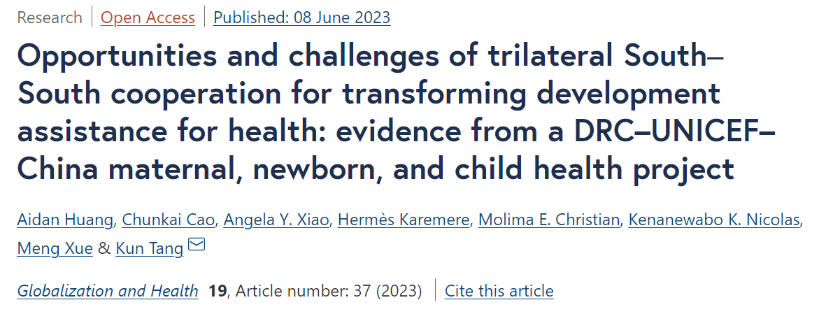 副教授唐昆团队与刚果金布卡武天主教大学(Université Catholique de Bukavu)在《全球化与健康》(Globalization and Health)发表了题为《南南三方合作推动卫生发展援助转型的机遇与挑战:基于刚果金—联合国儿童基金会—中国妇幼健康项目的证据》(Opportunities and challenges of trilateral South‒South cooperation for transforming development assistance for health: evidence from a DRC–UNICEF–China maternal, newborn, and child health project)的文章。研究成果旨在推动包括中国在内的新兴发展伙伴通过新型伙伴关系促进全球健康与良好福祉的可持续。