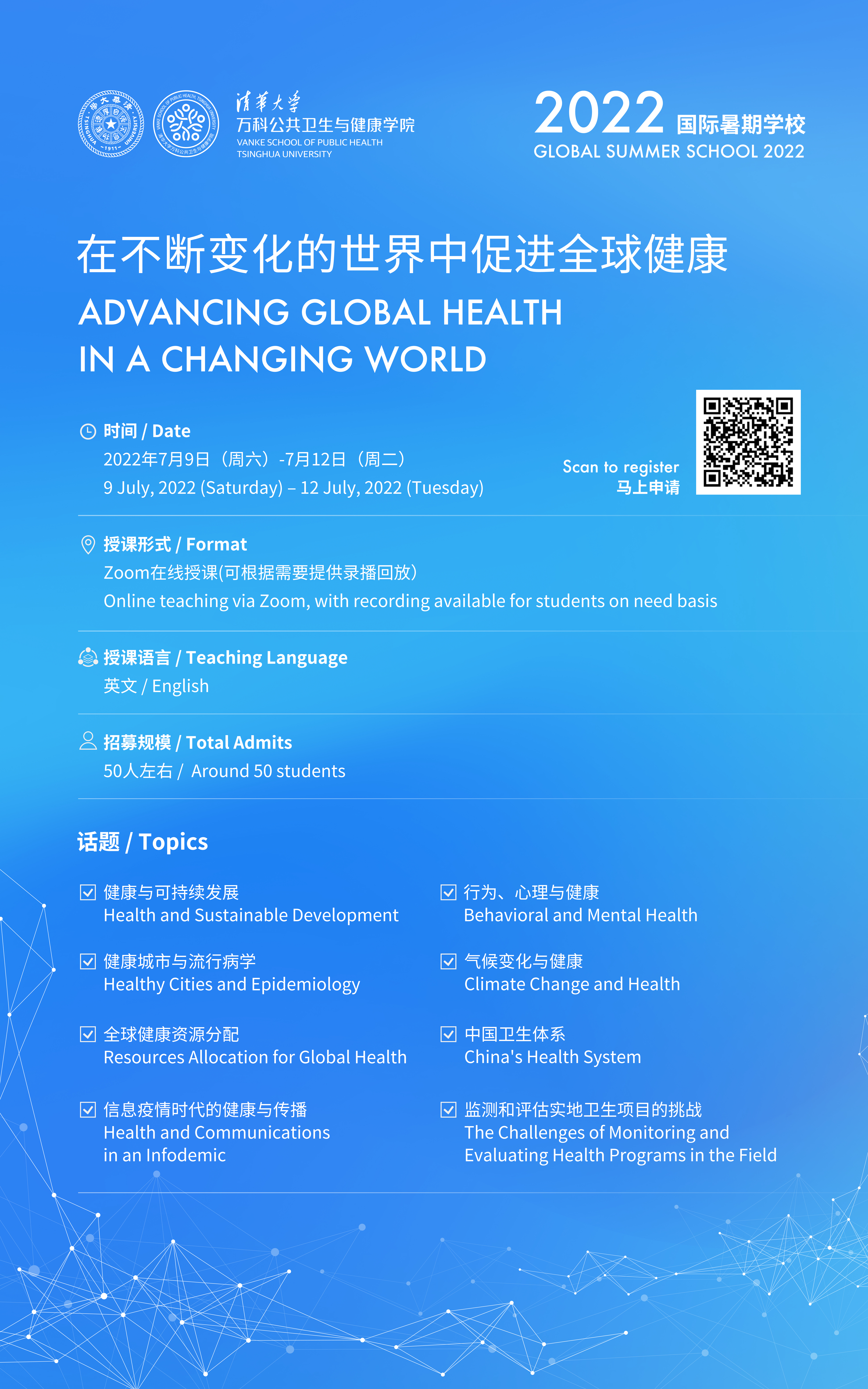 清华大学公共卫生与健康环球体育 2022年国际暑期学校将以“在不断变化的世界中推进全球健康”为主题,积极探索应对未来社会、环境与健康挑战的创新解决案建设更加可持续的世界。